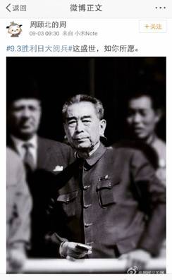 讓人難忘的細(xì)節(jié)不僅僅在閱兵場(chǎng)上。3日上午9時(shí)30分,習(xí)近平主席偕夫人彭麗媛正在天安門迎候各國嘉賓,閱兵尚未正式開始,會(huì)場(chǎng)內(nèi)外興奮期待的氛圍漸濃。就在此時(shí),網(wǎng)友“周顧北的周”發(fā)布了一條微博“這盛世,如你所愿”,配圖是一張周恩來總理的老照片。短短的七字微博引發(fā)了網(wǎng)友的強(qiáng)烈共鳴,轉(zhuǎn)發(fā)已過百萬。“開國大典的時(shí)候飛機(jī)不夠,周總理說飛兩遍,現(xiàn)在再也不需要飛兩遍了,要多少有多少。山河猶在,國泰民安。當(dāng)年送你的十里長安街,如今已是十里繁榮。”
