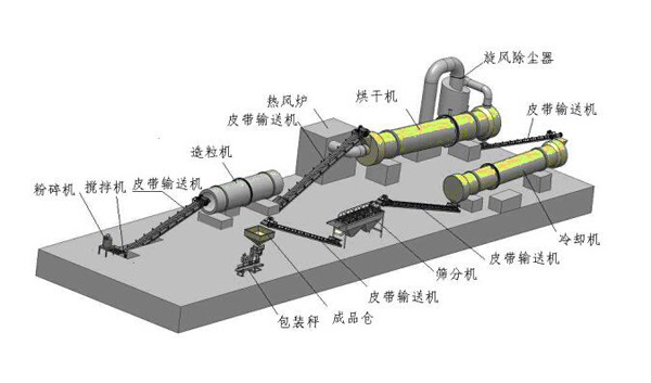 復(fù)合肥生產(chǎn)線工藝流程即原料配料→攪拌混合→粉碎結(jié)塊→造粒→一級(jí)篩分→顆粒烘干→顆粒冷卻→二級(jí)篩分→成品顆粒包膜→成品定量包裝。